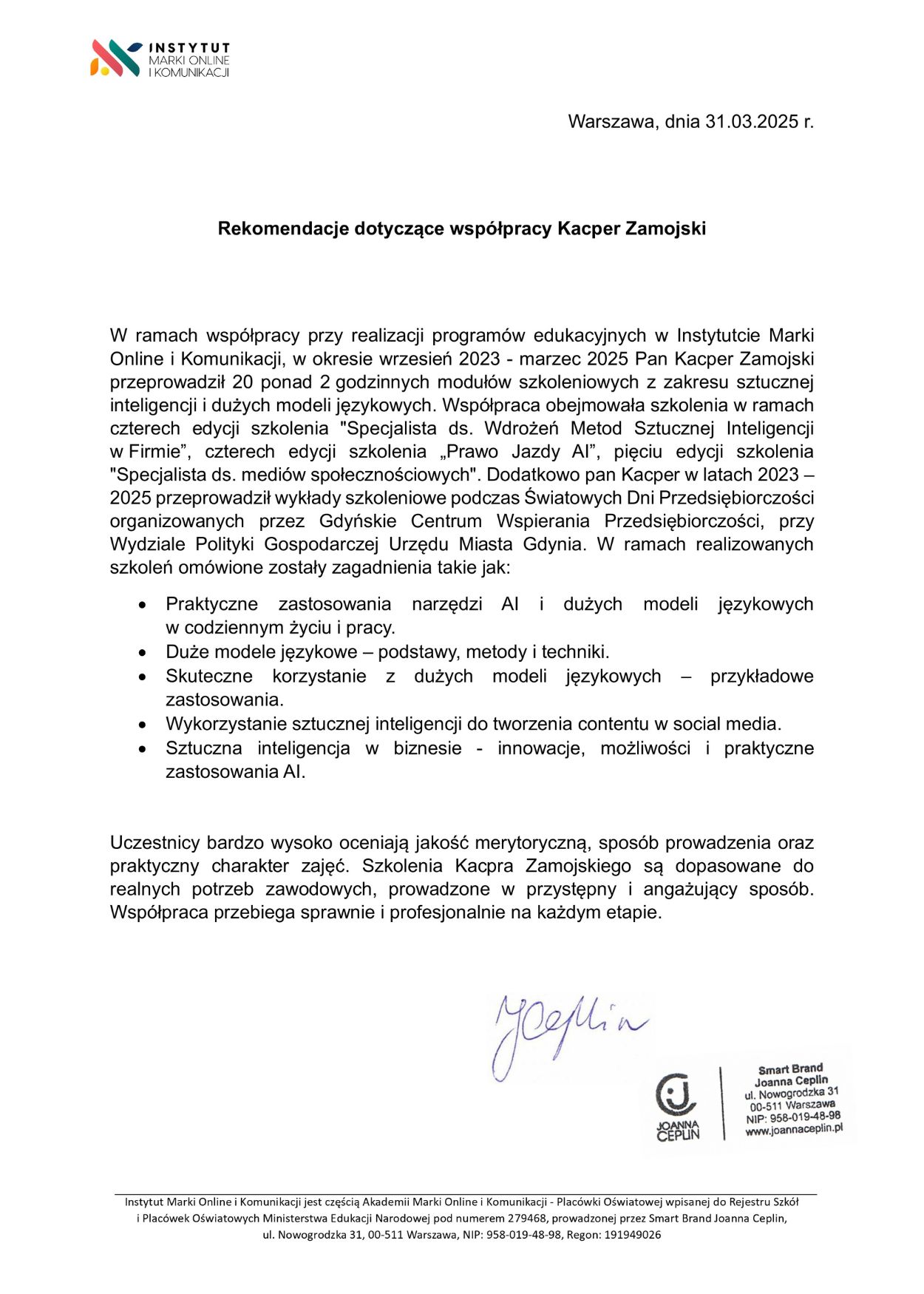 • Poprowadziłem kolejne szkolenia w Instytucie Marki Online i Komunikacji – w tym wykład o AI w e-commerce oraz warsztaty na temat “Wykorzystanie sztucznej inteligencji do tworzenia contentu na social media” w ramach 8., 9. i 10. edycji Specjalisty ds. SM. W sumie dla Instytutu Marki Online i Komunikacji przeprowadziłem w ostatnich latach już 23 szkolenia!